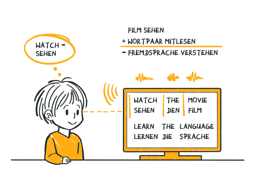 Du hörst einen Dialog oder eine Filmszene und liest gleichzeitig die sogenannte De-Kodierung mit. Auf diese Weise verbindet dein Gehirn Klang und Bedeutung – ganz natürlich.